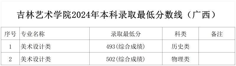 吉林艺术学院2024广西美术设计类烈士类最低分493。物理类最低分502。