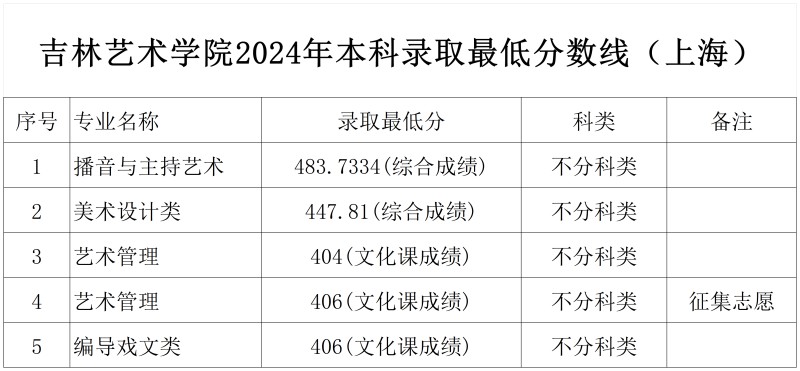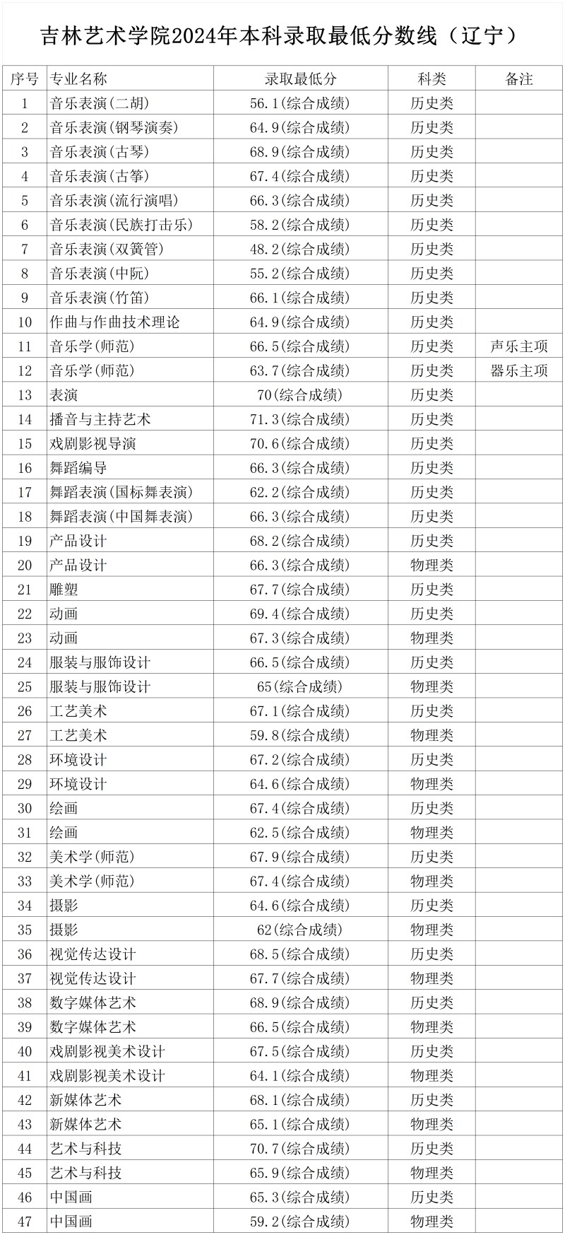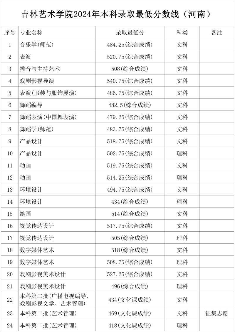 吉林艺术学院2024在河南播音与主持艺术最低分508,表演最低分520,戏剧影视导演最低分540,表演服装与服饰展演最低分486。