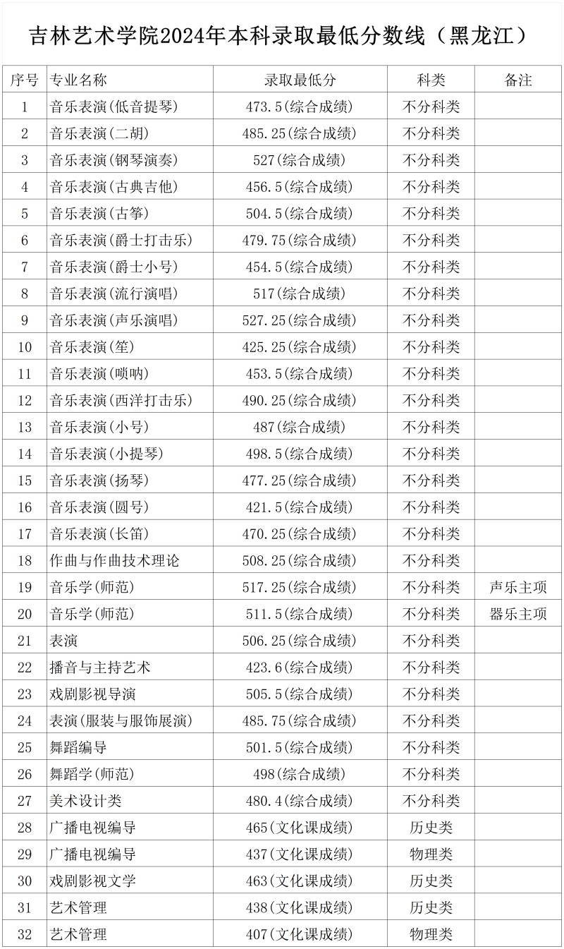 吉林艺术学院2024吉林省内音乐表演大号历史类最低分474,音乐表演单簧管历史类最低分521,音乐表演古筝历史类最低分513。