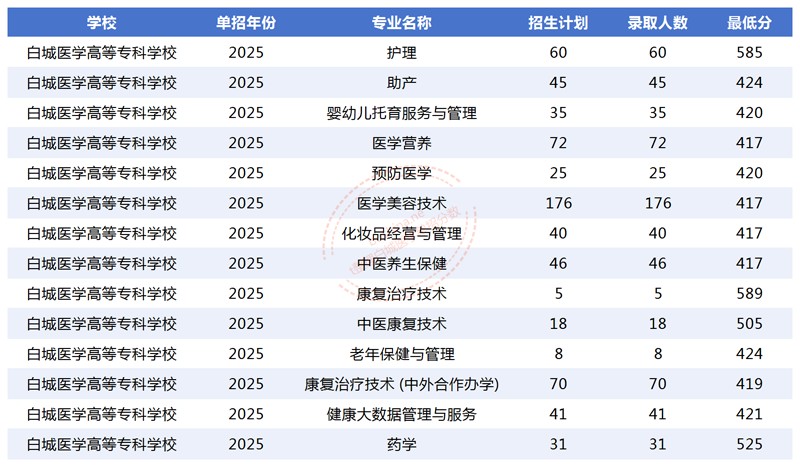 1、白城医学高等专科学校2025年单招专业分数线和录取人数